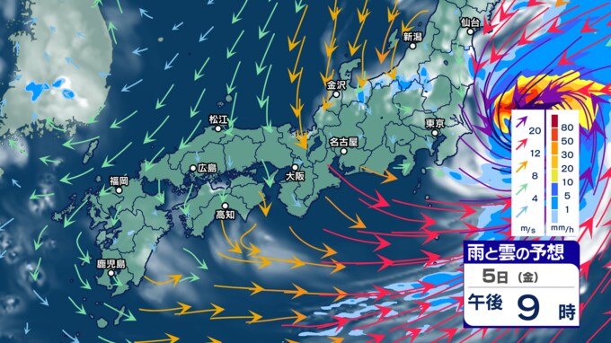 西日本から東日本では、5日にかけて、台風や太平洋高気圧の縁をまわる暖かく湿った空気が流れ込み、大気の状態が非常に不安定となるでしょう。台風から離れた地域でも雷を伴った非常に激しい雨が降り、大雨となるおそれがあります。また、5日には前線が東北地方にのびるため、北日本でも非常に激しい雨の降る所があるでしょう。