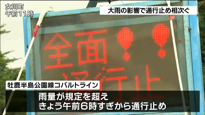岩槻日菜 記者:「大雨の影響で女川町のコバルトラインは全面で通行止めとなっています」大雨の影響で女川町と石巻市にまたがる牡鹿半島公園線コバルトラインは、雨量が規定を越し安全を確保できないとして、5日午…