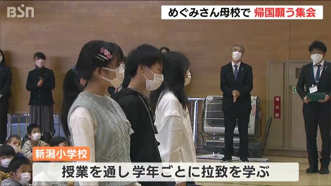 『横田めぐみさんの帰国を願う集会』が、拉致被害者・横田めぐみさんの母校である新潟市中央区の新潟小学校で28日朝に開かれ、児童達が拉致について学びました。