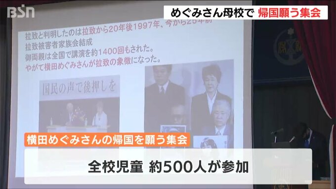 この集会は、学校の卒業生である横田めぐみさんが、北朝鮮に拉致されてから今も帰国できない事実を知ってもらうために、10年前から毎年開催しています。