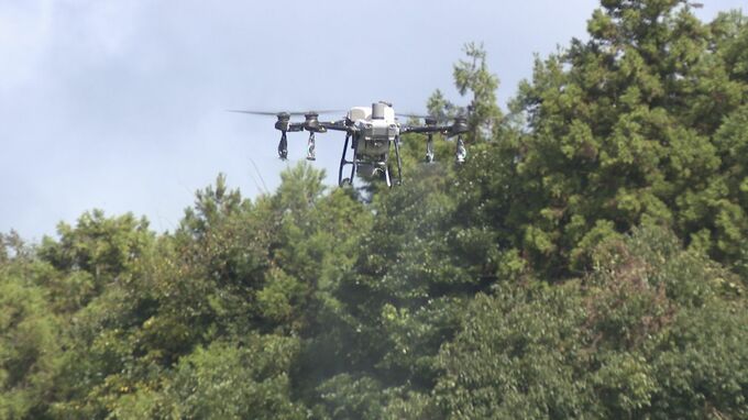 この取り組みは、ドローン事業や建設事業などを手がけるオーシャンテックが美祢市から委託されたものです。使用したのは、農薬散布ドローン「DJI Agras T25」。1分間に最大24リットルの農薬を散布できる中型のドローンです。