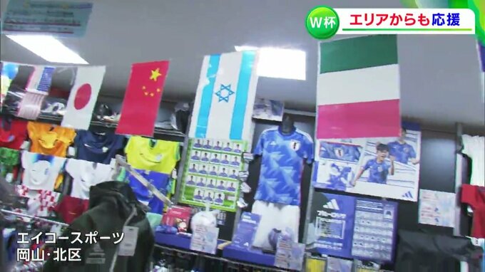 岡山市北区のエイコースポーツでは、レプリカユニフォームを特設コーナーで販売、ワールドカップ開幕後に売上が3割ほど増えたと言います。きょうは、スペイン戦に向けて日本代表のユニフォームを買い求める客の姿もありました。