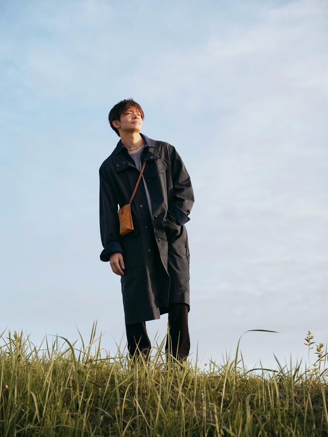 さらに、黒のロングコートを着用した写真では、シンプルながらも存在感のあるスタイリングで秋の草原に立つ岸さんの姿が捉えられています。肩にかけたベージュの小さなバッグがアクセントとなり、全体的にバランスの取れたコーディネートとなっています。