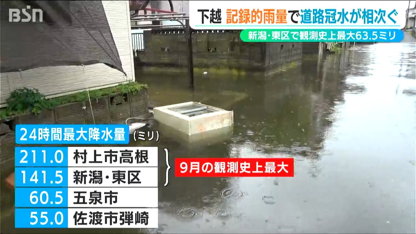 午前11時までの24時間降水量も、村上市高根と新潟市東区で9月の観測史上最大を記録。各地で排水が追い付かず道路の冠水が相次ぎました。