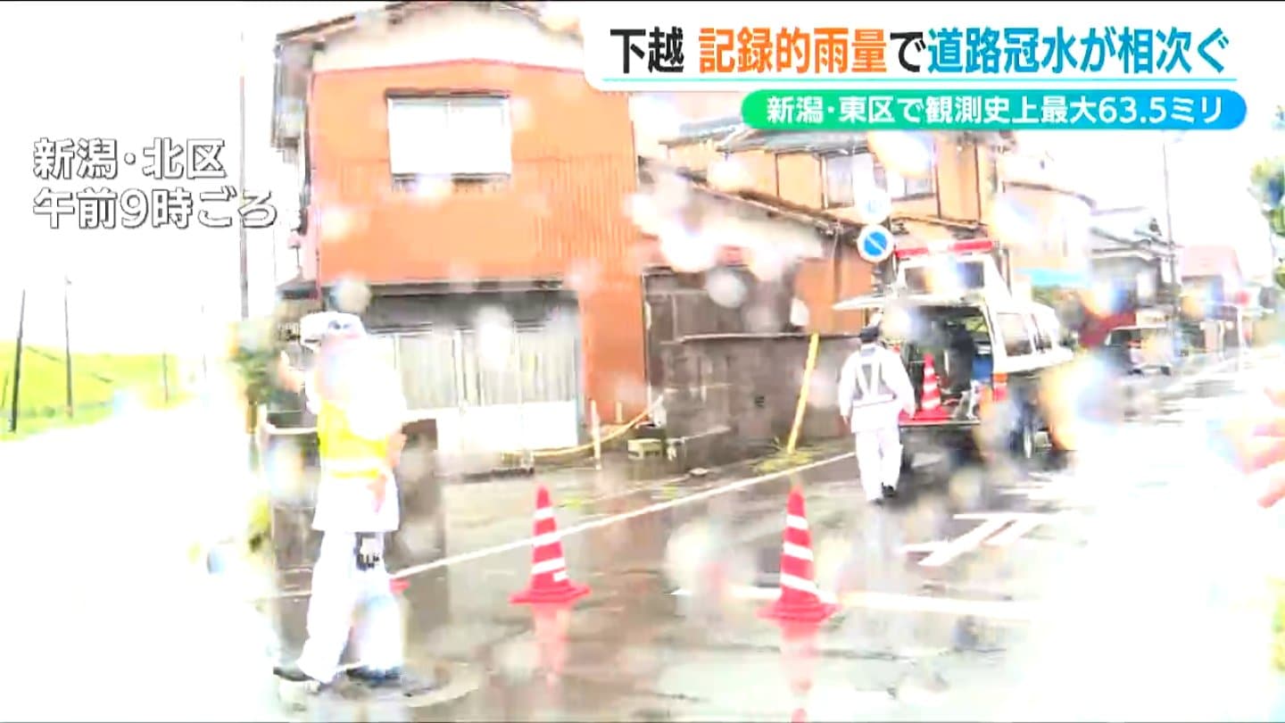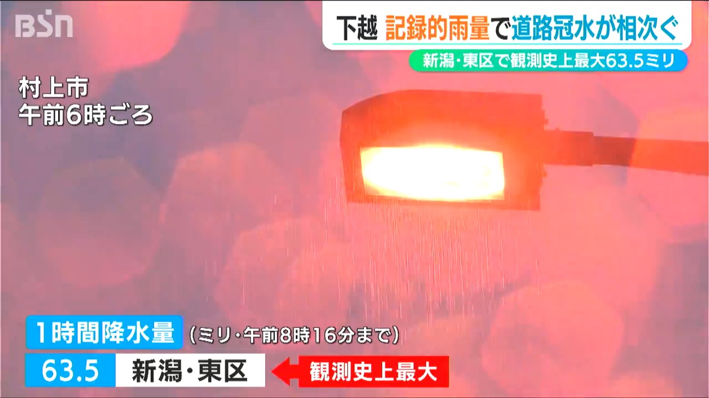 県内は前線が通過した影響で未明から雨が強まり、新潟市 東区では午前8時16分までの1時間に観測史上最大となる63.5ミリの降水量を観測しました。