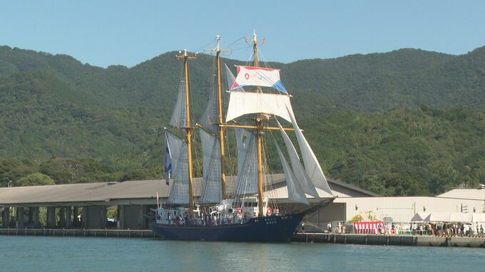 帆船「みらいへ」は未来の航海士や機関士を育てる練習帆船で、6日午前9時ごろ、萩港に接岸しました。「明治日本の産業革命遺産」の世界遺産登録10周年を記念して、萩市が招いたものです。