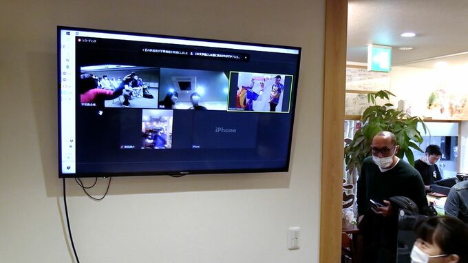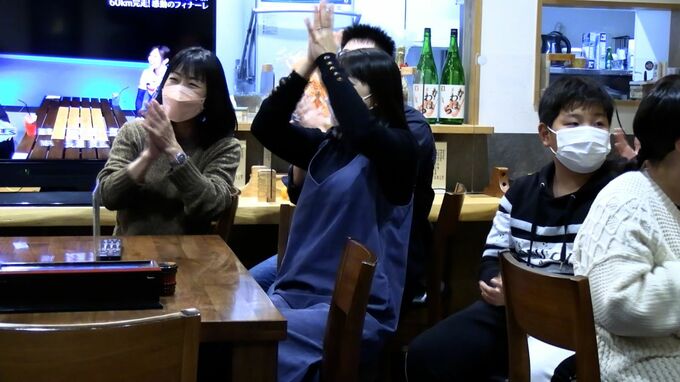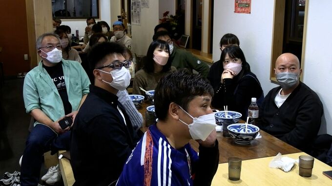 倉敷市真備町のうどん店で開かれたパブリックビューイングには、地元の住民ら約50人が集まりました。