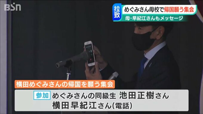 めぐみさんの同級生である池田正樹さんも集会に参加し、母・早紀江さんも電話で児童たちにメッセージを送りました。