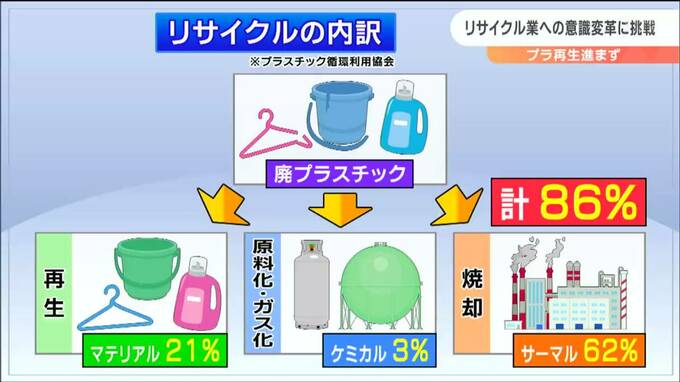 廃プラスチックのリサイクルには、異物を取り除き再生プラスチックを作る「マテリアルリサイクル」や、廃プラを焼却し熱など回収する「サーマルリサイクル」など3つあり、リサイクル率は▼86%です。しかし、本来、推進するべき「マテリアル」は、2割強にすぎません。