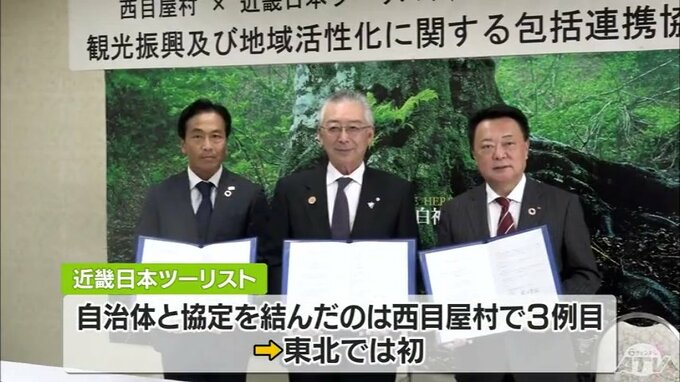 観光客の増加や地域経済の活性化などに連携して取り組もうと西目屋村と旅行会社が連携協定を結びました。締結式には西目屋村の桑田豊昭村長と近畿日本ツーリストの高浦雅彦社長、クラブツーリズムの中村朋広本部長…