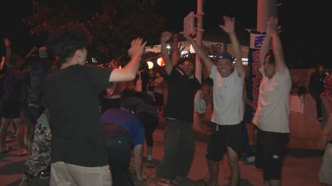 午後8時を過ぎると住民らが公民館前の交差点に続々と集まり、歌や踊りではやしたてるなか綱が結び合わされました。