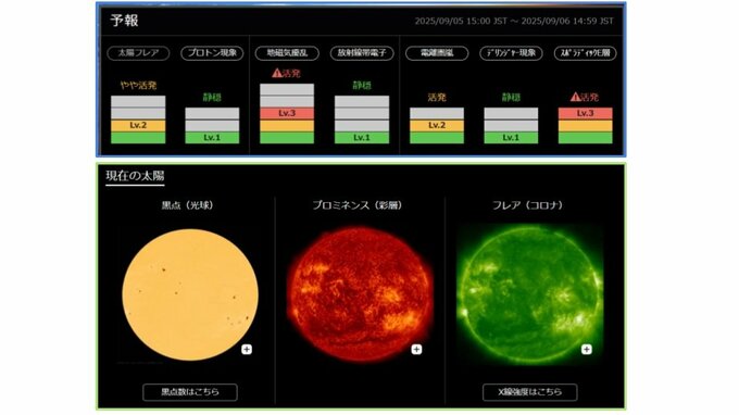 宇宙の状況は「宇宙天気予報」で知ることが出来ます。これは情報通信研究機構が宇宙を観測し、影響を予測して、地上の天気予報と同じように発表するものです。1988年から「宇宙天気」の予報が始まり、2019年からは24時間体制で監視されています。