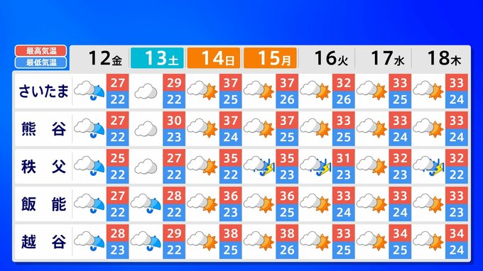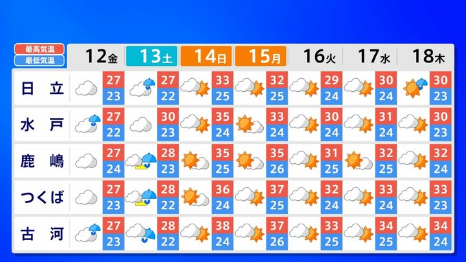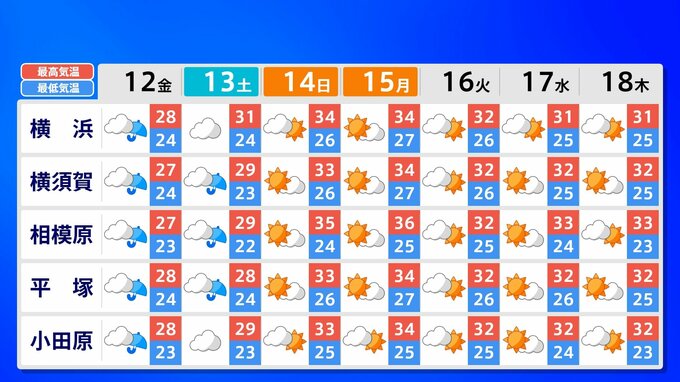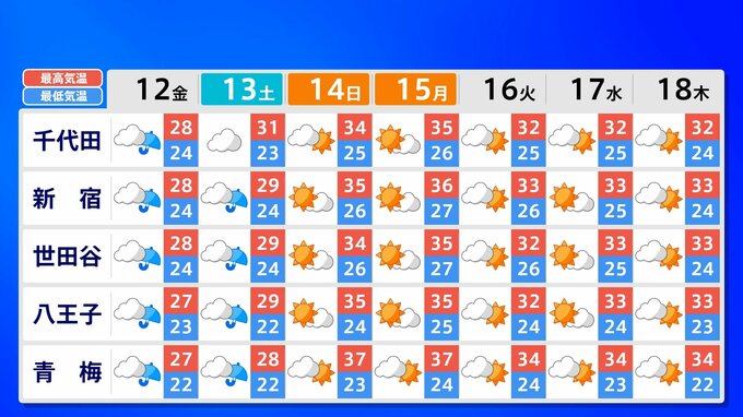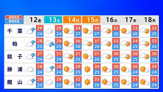 【東京首都圏 大雨情報】秋雨前線 関東地方に南下 あす明け方にかけて非常に激しい雨のおそれ【雨と発雷確率のシミュレーション・3連休の天気は?・週間予報】東京・神奈川・埼玉・千葉・群馬・栃木・茨城 南日本放送 2025年9月11日(木) 13:00 国内 天気 週間予報(東京・神奈川・埼玉・千葉・群馬・栃木・茨城) 13日(土)から3連休は、多くの地点で陽射しが戻りますが、35℃以上の猛暑日の予想も多く、9月も半ばですが「熱中症対策」が必要でしょう。週間予報(天気マークと予想気温)は画像で確認できます。