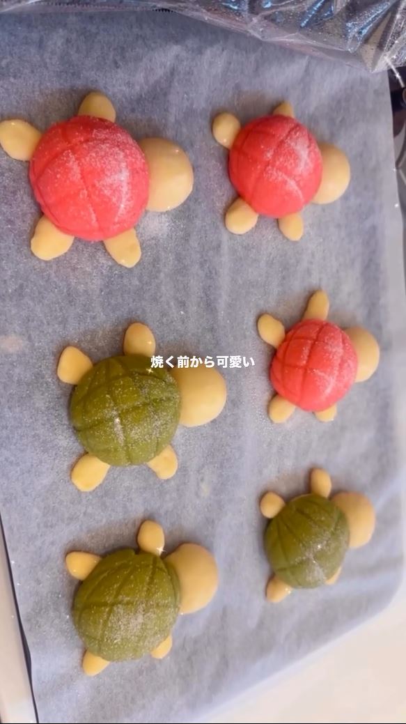 希空さんは「焼く前から可愛い」とコメント。赤と緑の2色のクッキー生地で亀の甲羅が表現され、砂糖がまぶされています。周囲には薄い色の生地で作られた亀の頭と足も付けられており、リアルな亀の形が再現されています。