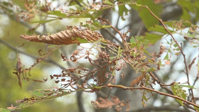 原因は“小さなタマムシ”の大量発生 ケヤキが枯れたように見える現象が相次ぐ 山梨・峡南地域 テレビ山梨 2025年9月11日(木) 21:05 国内 ヤノナミガタチビタマムシ この虫は体長3ミリ~4ミリで、幼虫も成虫もケヤキの葉を食べます。 ケヤキは食べられた葉を秋の前に落とすため、8月から葉の無い木が増えました。 今年、被害が増えた要因は梅雨に関係があるようです。