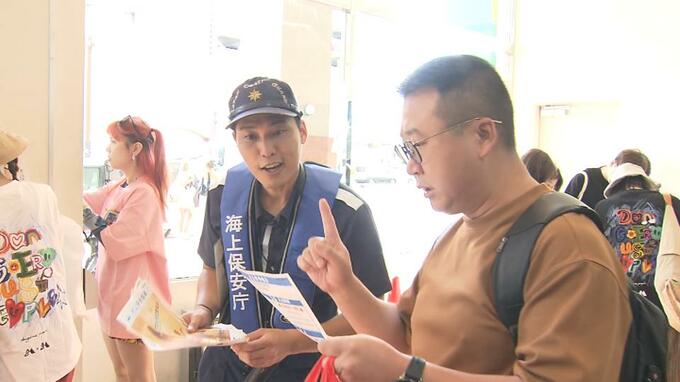 またターミナルの待合室では、海上保安庁が12か国語で作成したパンフレットを外国人客に配布しながら、海を安全に楽しむための注意点を伝えていました。