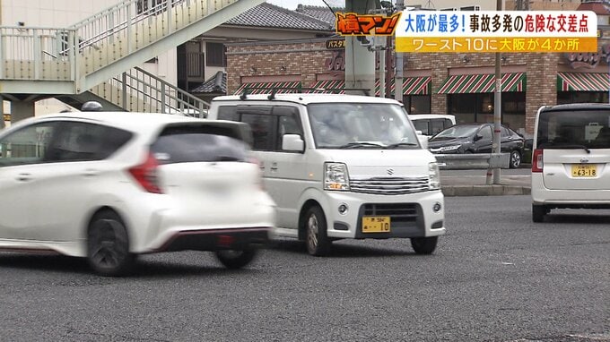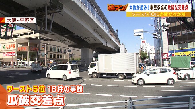 ワースト5位に入った大阪市平野区にある瓜破交差点では、右折や左折時の追突事故などが18件発生。
