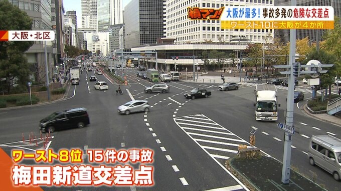 ワースト8位の大阪市北区にある梅田新道交差点では、右折時の衝突事故など15件の事故が起きました。