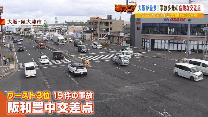梅新東交差点以外のランキングに入った府内の交差点はどのような状況なのか。取材班がまず訪れたのは、梅新東交差点と同じく19件の事故が起きた大阪府泉大津市の阪和豊中交差点。大阪南部を縦断する国道26号と市道が交差しています。