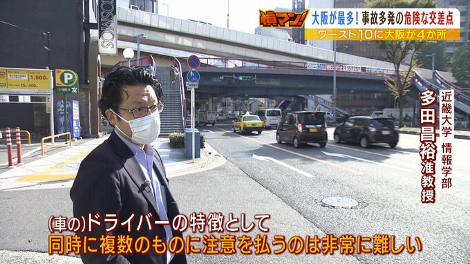 通行する車が多いうえ、いつでも左折可能な車線が2車線あるため、ドライバーの注意が散漫になりやすいと指摘。そのうえで、ドライバーの確認すべきポイントを減らすことが有効だと言います。