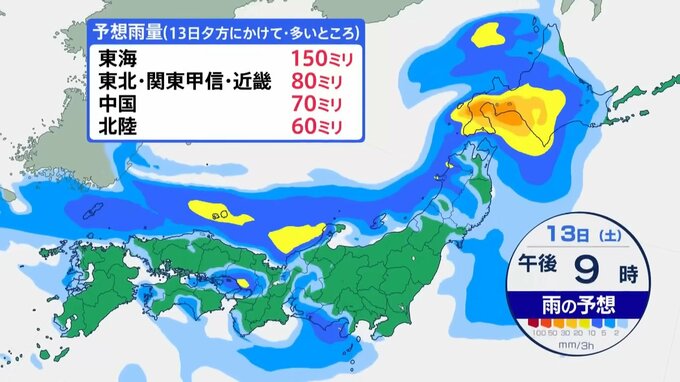 13日(土)は、北海道~九州北部の広い範囲にかけて警報級の大雨になる恐れがあります。特に東海地方では、夕方にかけて150mmの雨が降る見込みとなっています。