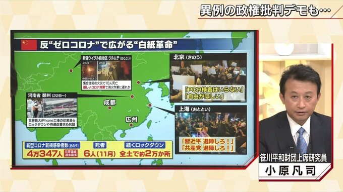 「“白紙”は言えないけれど言いたいという思いの表れ。この白紙革命は2年前の香港でもあった。ウクライナ侵攻に反対するロシア国内でもやられていて、ある程度国際的な抗議の形になっています。(中略)この運動はSNSでの広がりも速く、なかなか収まらないかと…」