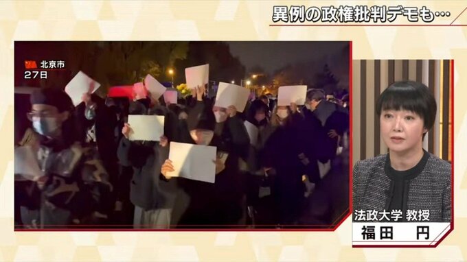 「習近平氏が行いたいのは、共産主義への回帰であって、締め付けるということ。言論の自由もさらに統制される。白紙革命はそれに対する不満の表れ。そうした中で制度的には一強体制を作った習近平氏ですが、国民の支持はまだ得ていない。まだ抑え込みたいという中で、過ちを認めるわけにはいかない」