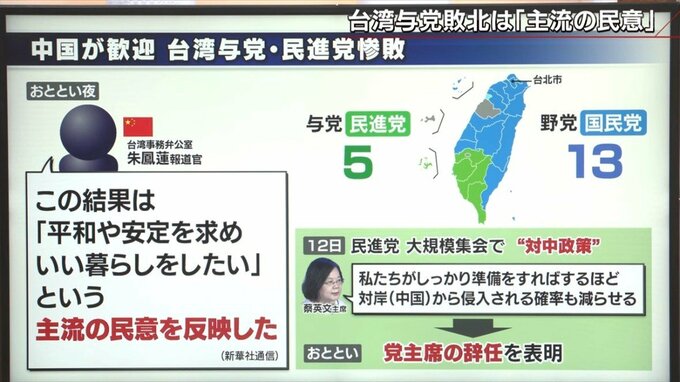 中国で国民の不満が爆発している中、台湾でも大きな動きが起きた。統一地方選挙で与党が敗北。中国と距離をとる蔡英文総統が与党・民進党の代表の座を下りた。
