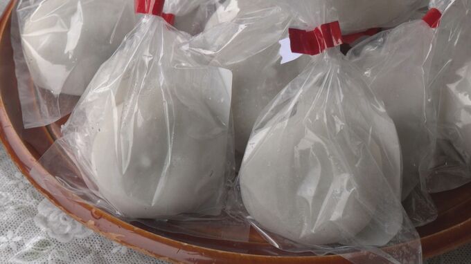 収穫された「もち米」は施設内の行事などで使われ、14日は稲刈りの様子を見守っていた観光客らに去年、収穫した「もち米」で作られた「大福餅」が振る舞われていました。