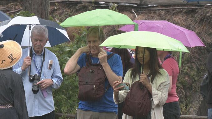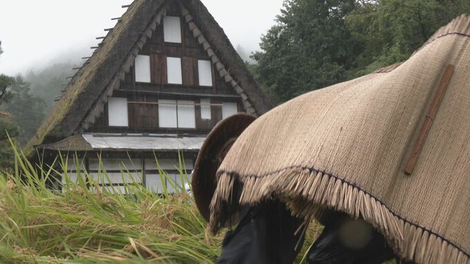 観光施設「飛騨の里」ではあいにくの雨の中、傘をかぶった職員が車田に植えられた「もち米」を鎌で丁寧に刈り取っていきました。