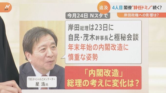 「なぜあんなに脇が甘いのか、もうもたなそうだ」と与党幹部から冷ややかな声も。TBSスペシャルコメンテーターの星浩さんは、「支持率低下で行き詰まった局面の打開策の1つが内閣改造。岸田総理は慎重に日程調整しているのでは」と解説。岸田総理のリーダーシップに疑念が生じている状況である一方、「安倍政権が長く続いた影響で"次の総理候補"が育っていない現状もある」と指摘しました。