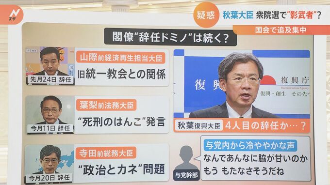 秋葉大臣が4人目の辞任となるのかどうか。様々な疑惑が上がっていることに関して、与党幹部も「なんであんなに脇が甘いのか。もう、もたなそうだね」というような冷ややかな声も聞こえているということなんです。