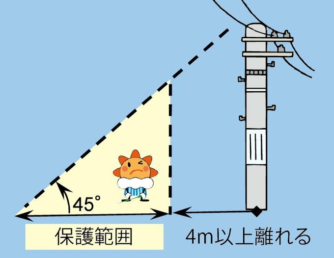 気象庁によりますと、「保護範囲」とは、電柱、煙突、鉄塔、建築物などの高い物体のてっぺんを45度以上の角度で見上げる範囲で、その物体から4m以上離れたところ【画像②】のことです。