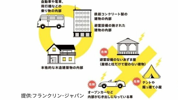 「雷が聞こえたら、できるだけ早く建物や車などへ避難しましょう。しかし、建物や車も100%安全とは言い切れない点には注意が必要です【画像③】」