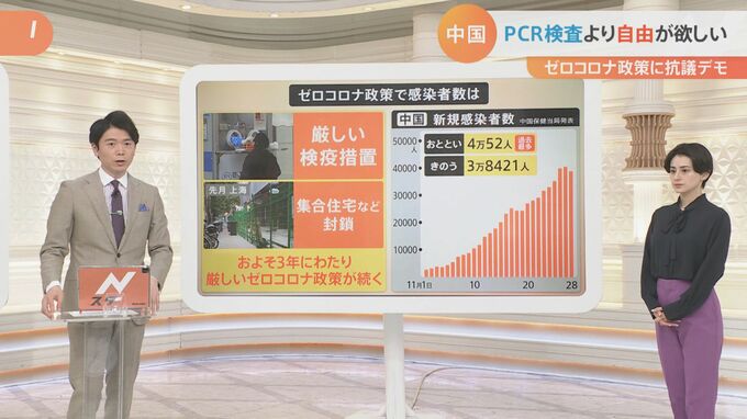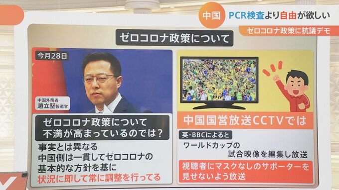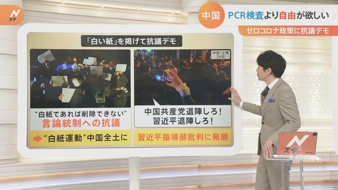現代中国研究が専門の東京大学大学院・阿古智子教授によりますと「暴力的にPCR検査を受けさせられたり、火事でも、子供が死にそうでも家から出られない。非常に過酷な状況が起こっている。さらに厳しい言論統制の影響で都市部の中間層も『自分たちに自由を』と言い始めており、中国全土で不満がたまっている状況」ということです。