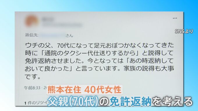 熊本県在住の40代女性。福岡県在住の父親(70代)のある行動がきっかけで免許返納を考えたといいます。