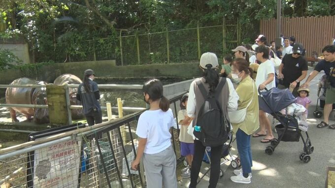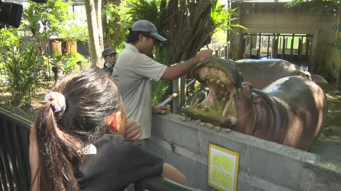 敬老の日の15日、沖縄こどもの国で「長寿動物祝い」が開かれ、子どもたちが国内最高齢のカバなどを祝福しました。