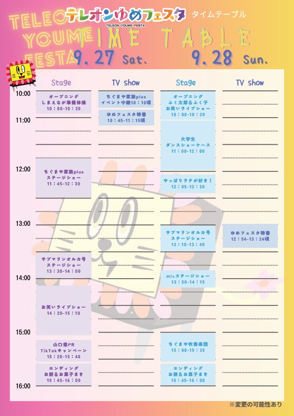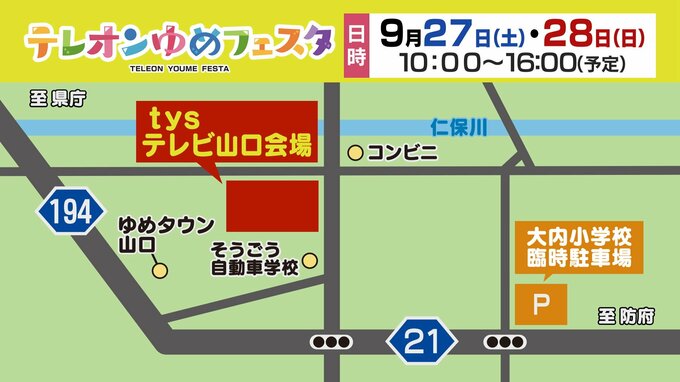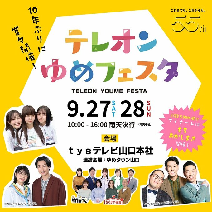 テレビ山口は、開局55周年を記念して大型イベント「テレオンゆめフェスタ 」を9月27、28の両日、テレビ山口本社(山口市大内千坊6-7-1)で開催します。