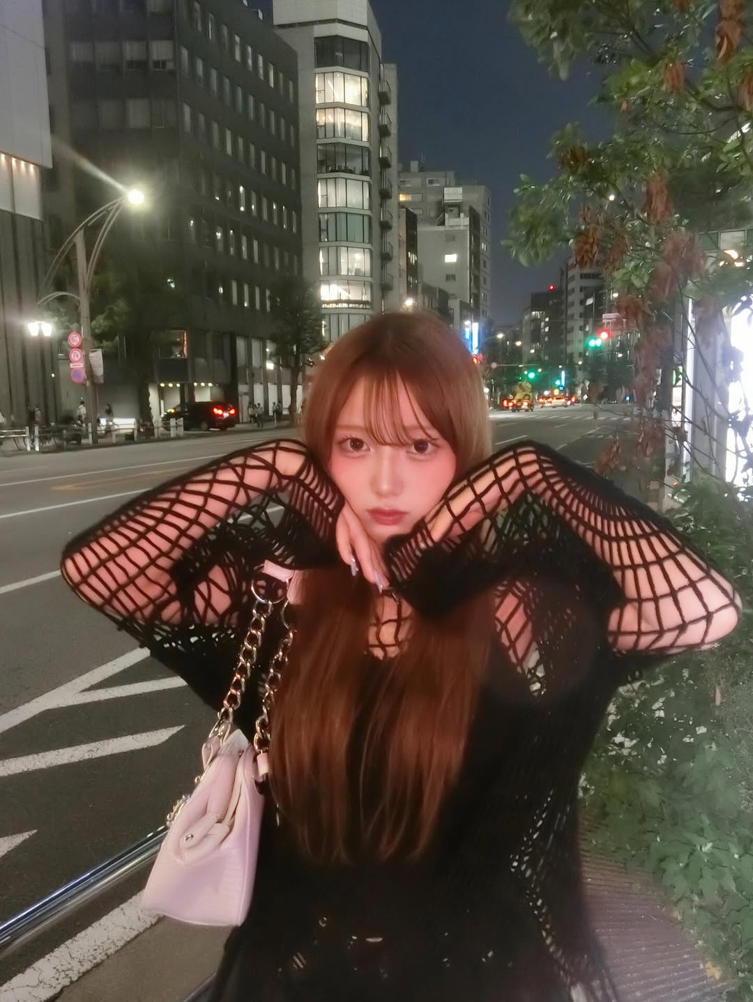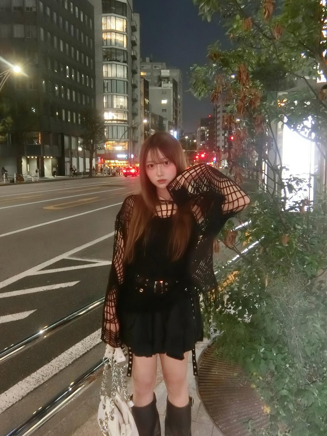 希空さんは、映画鑑賞の後なのか、夜の街中を背景に、黒いネット状のトップスにブーツというコーディネートで、肩には白いチェーンバッグを掛け、スタイリッシュなお出かけスタイルを披露しています。