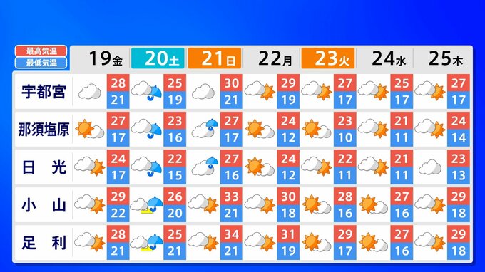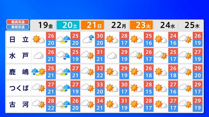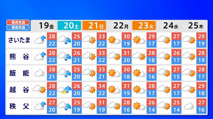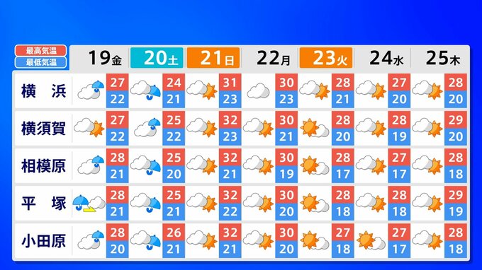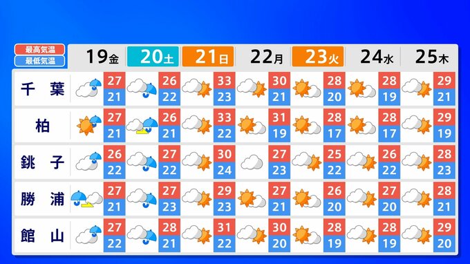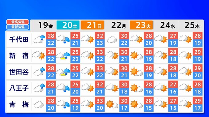 【東京首都圏 ゲリラ雷雨発生】秋雨前線南下 猛暑はきょうまで 東京 あす28℃ あさって25℃ 【雨のシミュレーション・ピンポイント天気・週間予報】雨はいつどこで?あすは何℃? 南日本放送 2025年9月18日(木) 14:00 国内 天気 関東地方各都市の週間予報 週間予報を『各県につき5つの都市』ずつ画像で掲載しています。東京都心の20日(土)の予想最高気温は25℃で、その先も今までのような厳しい暑さにはならなくて済みそうです。画像でご覧ください。