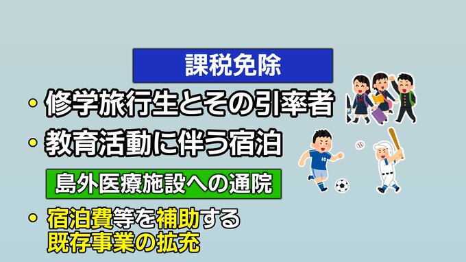 そして課題となっていた離島住民への課税免除については修学旅行に加え、部活動など教育活動に伴う宿泊を課税免除とし、さらに島の外の医療施設に通うために必要な宿泊費などは既存の補助事業を拡大していくことを検討しています。