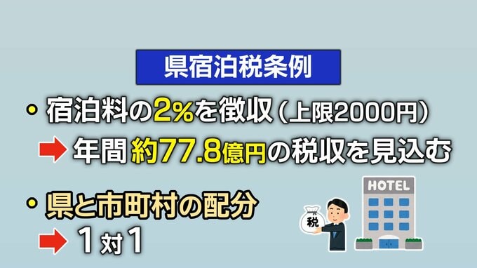 県の「宿泊税」条例は2000円を上限に、宿泊客から宿泊料の2パーセントを徴収するもので、宿泊税導入による税収規模は年間77.8億円と試算されています。