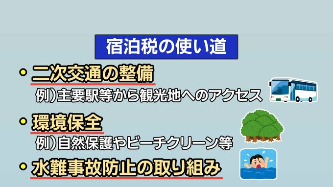 具体的な使い道ですが、二次交通の整備、環境保全、水難事故防止の取り組みなどが想定されています。