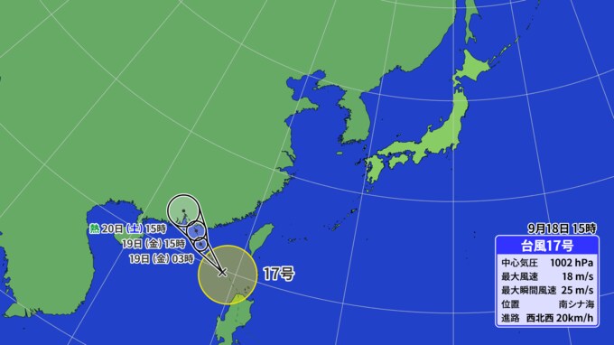 18日午後3時に、南シナ海で「台風17号」が発生しました。この後、大陸方面へ進む見込みで、日本に直接的な影響はないとみられます。