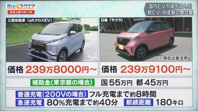 日産「サクラ」は受注が多く受注停止になっているほどで、大変な人気だ。「eKクロスEV」と「サクラ」はいずれも239万円台からだが、国の補助金55万円と東京都の場合、都の補助金45万円が適用されると100万円安くなり、139万円からとなる。