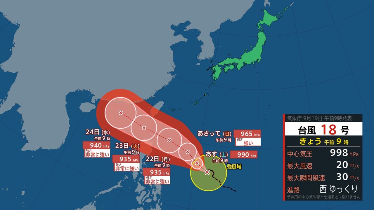 台風18号は、19日9時には