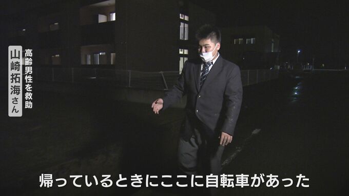 暗闇にポツンと自転車? スマホで照らすと人影が…男子高校生とっさの判断で救助 チューリップテレビ 2022年12月7日(水) 16:45 国内 話題・グルメ 用水路に転落した高齢の男性が、帰宅途中の男子高校生によって救助されました。男子高校性は暗闇に放置された自転車に違和感を覚えたといいます。 高齢男性を救助した高校1年生 山崎拓海さん: 「最初は見えなくて、自分が近づいて見てみたら男性が倒れていました」 富山県上市町に住む高校1年生、山崎拓海さん。 山崎さんは10月11日の午後6時前、学校からの帰宅途中にある違和感を覚えました。 高校1年生 山崎拓海さん: 「帰っているときにここに自転車があったんです」 暗闇の中、田んぼのそばに放置されていた自転車に違和感を覚えた山崎さん。寒くて暗い中、田んぼを訪れる人がいるのか…。 持っていたスマホのライトを点けてあたりを確認します。