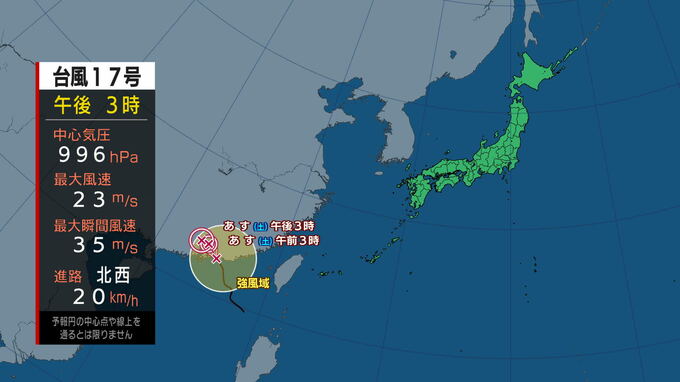 南シナ海にある台風17号は、9月20日までに熱帯低気圧に変わる見込みです。日本への影響はないと見られます。