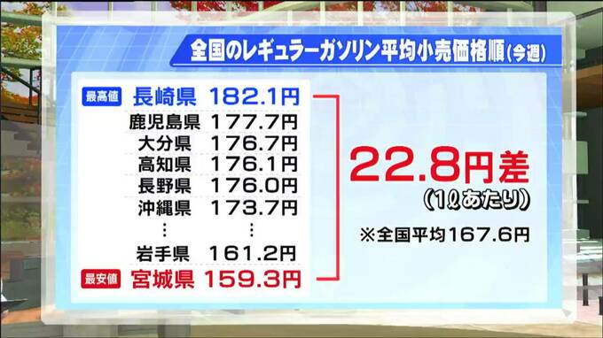石油情報センターによりますと、今週全国で最も高かったのは長崎県で、1リットル当たり▼182円10銭。最も安い宮城との差はなんとおよそ▼23円となっています。全国平均を見ても▼167円60銭なので、宮城は大きく下回っていることがわかります。