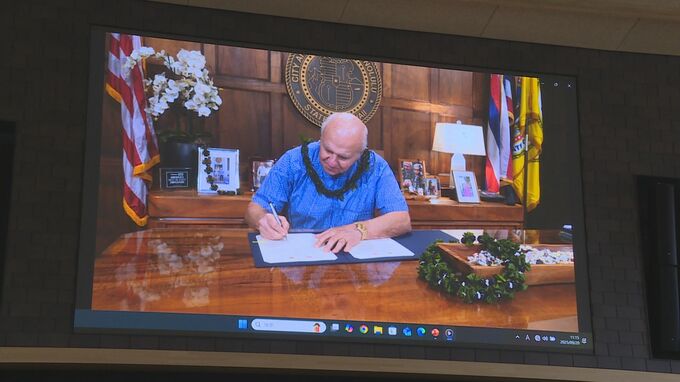 20日に調印式があり、山口市の伊藤和貴市長らが協定書に署名しました。ホノルル市のリック・ブランジアーディ市長は出席できませんでしたが、事前に署名をしていて、ビデオメッセージも届きました。